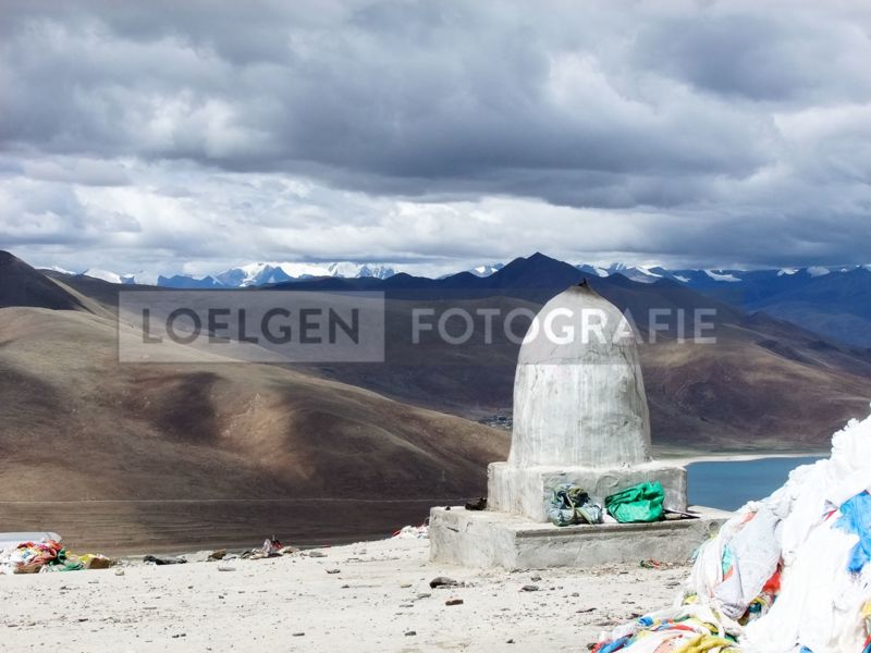 Blick vom Pass Kampa La auf den Yamdrok Tso Rauchopferofen